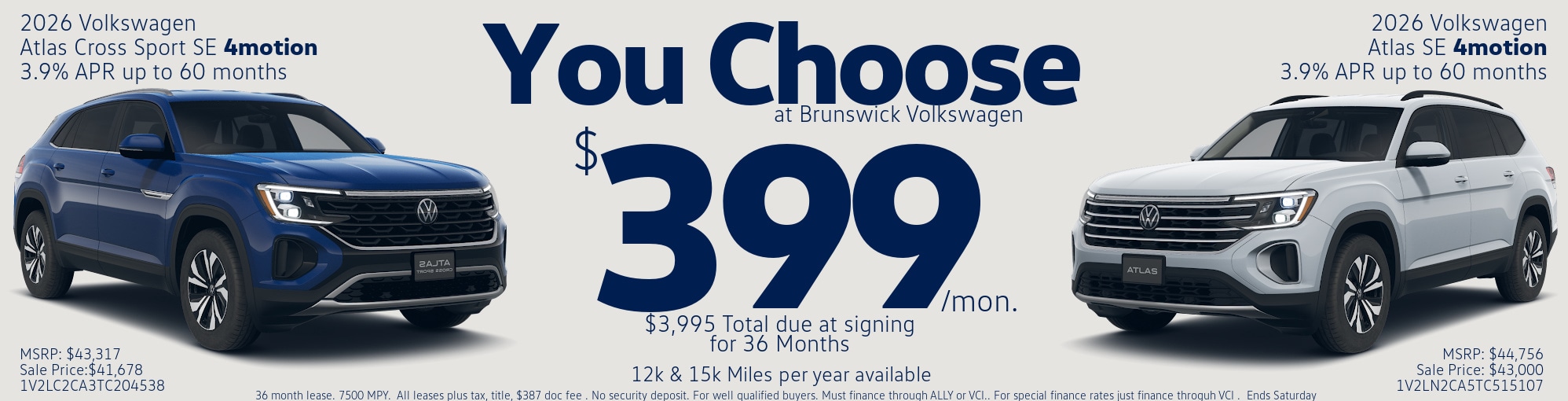 Find your next Volkswagen Atlas Cross Sport and enjoy premium performance, innovative technology, and refined craftsmanship at a price designed to fit your lifestyle. At Brunswick Volkswagen, we're committed to helping drivers from Cleveland, Medina, Akron, and throughout Northeast Ohio find the perfect lease to match their budget and needs. Browse our current Volkswagen lease specials online or visit our dealership in Brunswick to take a test drive today. Discover why so many Ohio drivers choose Brunswick Volkswagen for their Atlas Cross Sport lease deals and exceptional customer experience every time.